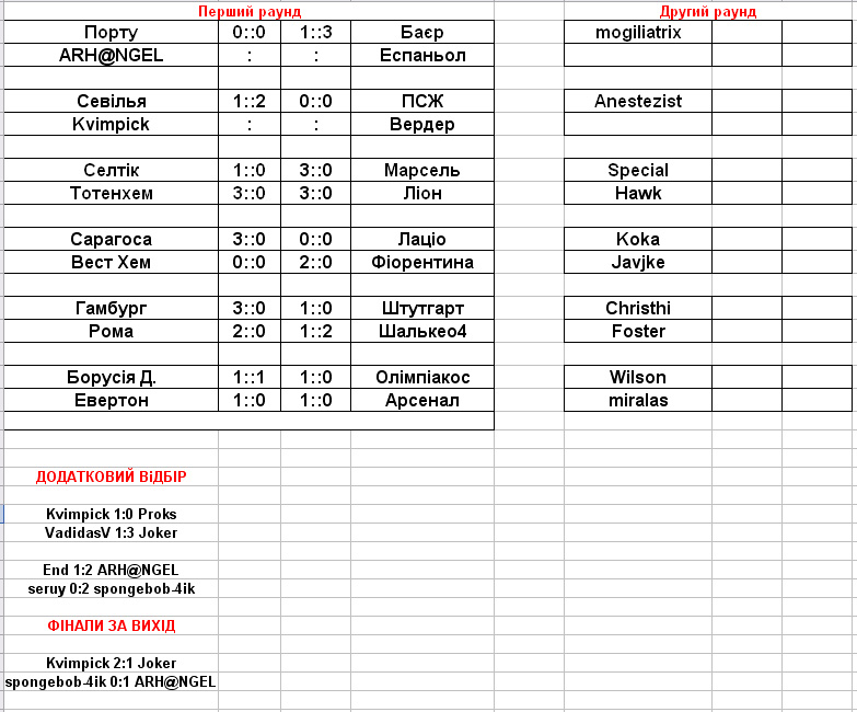 | 3 коло miralas(Everton) 0:0 Crishti(HSV) Crishti(HSV) 0:0(Додатковий час 0:3, Goals: Johnson 95', Yakubu 105',107') miralas(Everton)